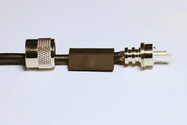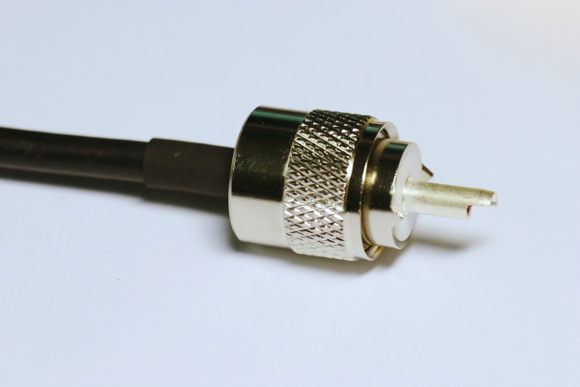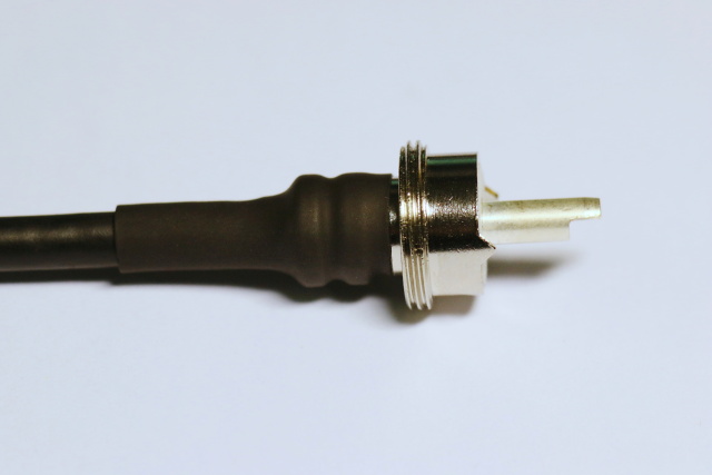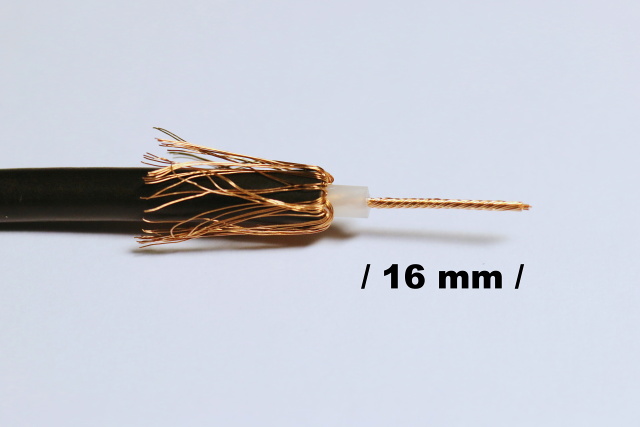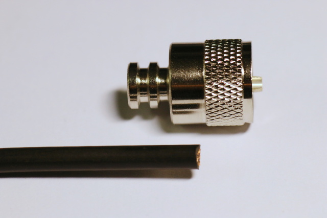 Obrazová informace, s popisem fotografií, postupu instalace kabelu RG58 do PL 6 konektoru.